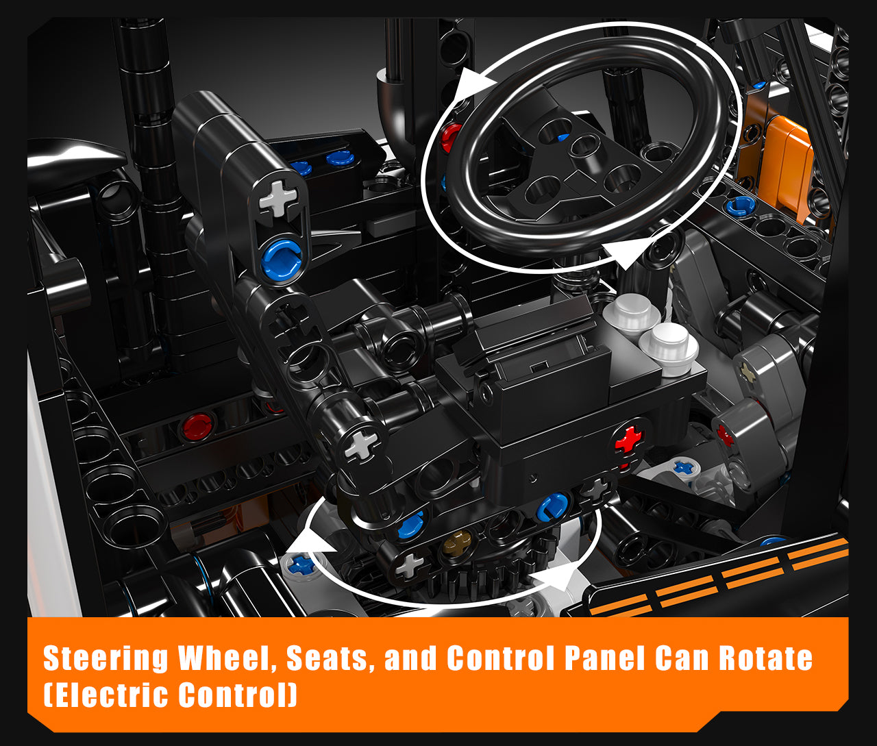 Crafted with an eye for detail, the forklift flaunts a range of electrically controlled elements such as adjustable fork width, an engine hood that opens to reveal a simulated engine design, and a moving windshield wiper for that extra touch of authenticity. The doors open to showcase a detailed cab with rotating seats and a control panel, further enhancing the interactive experience.