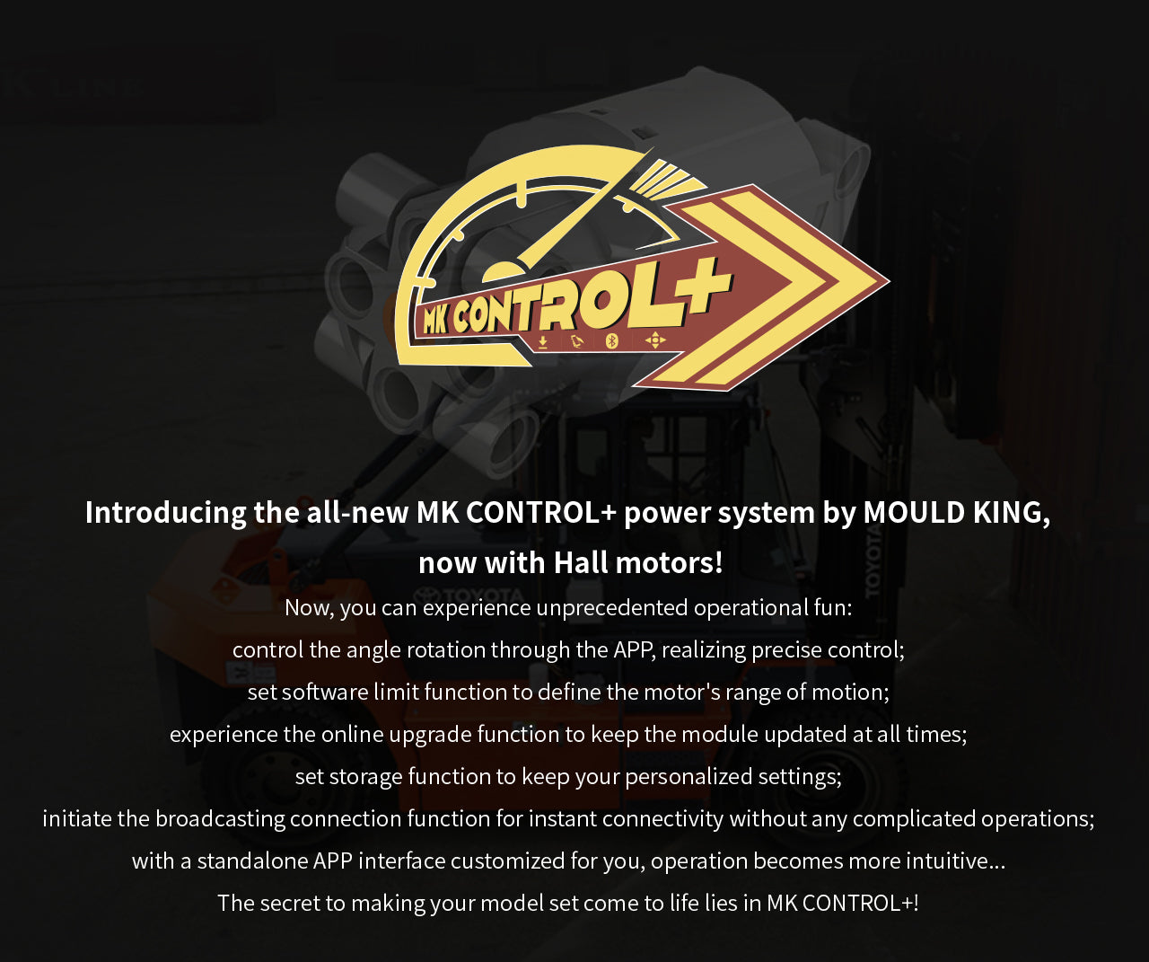 Our new MK CONTROL+ power system, now fully integrated with HALL motors, offers an experience that's truly next level. Command precise movements, set exact motor range motions, and keep your module updated in real-time. This system, combined with the standalone APP interface, ensures that you are always in control, making the model feel alive beneath your fingertips.