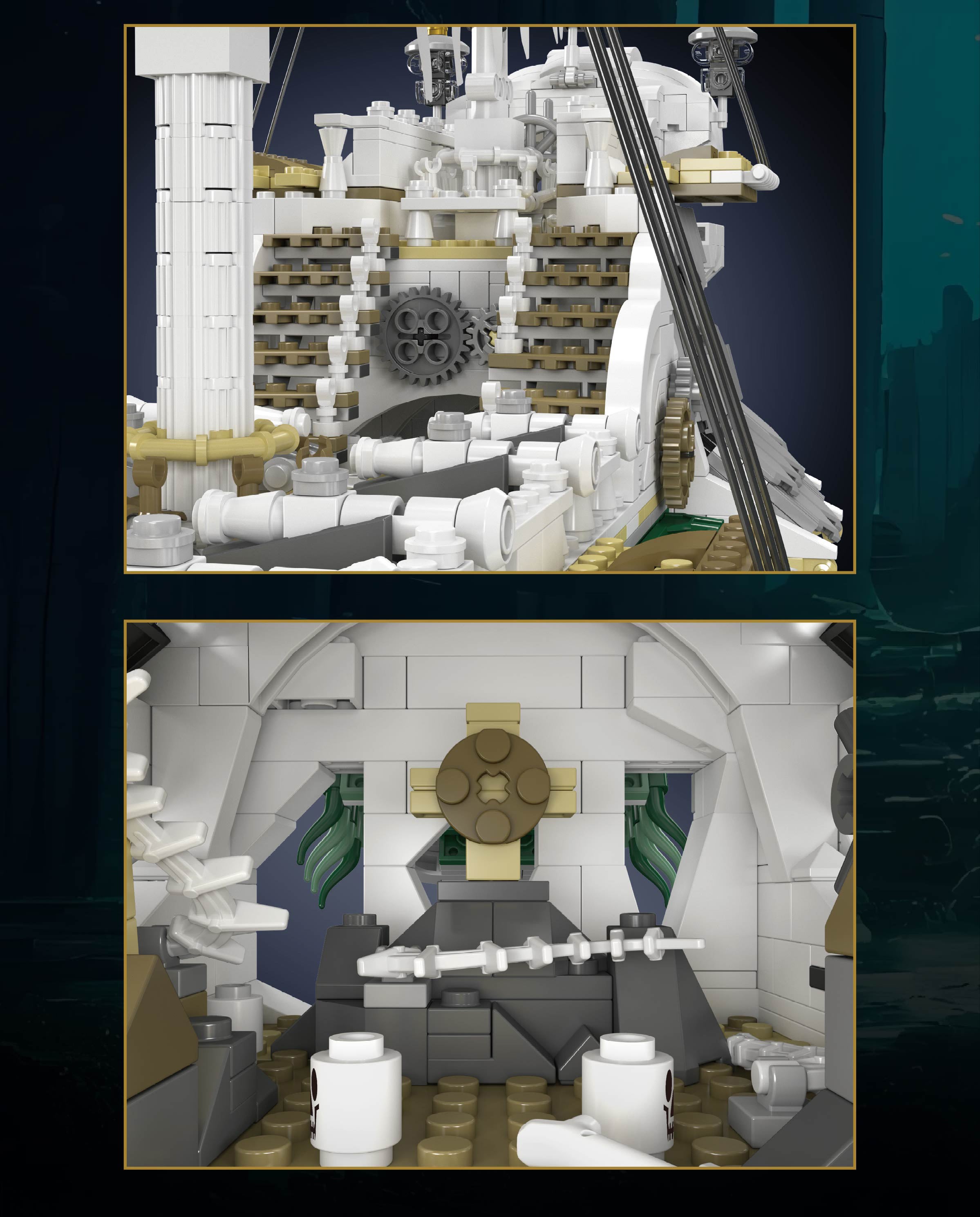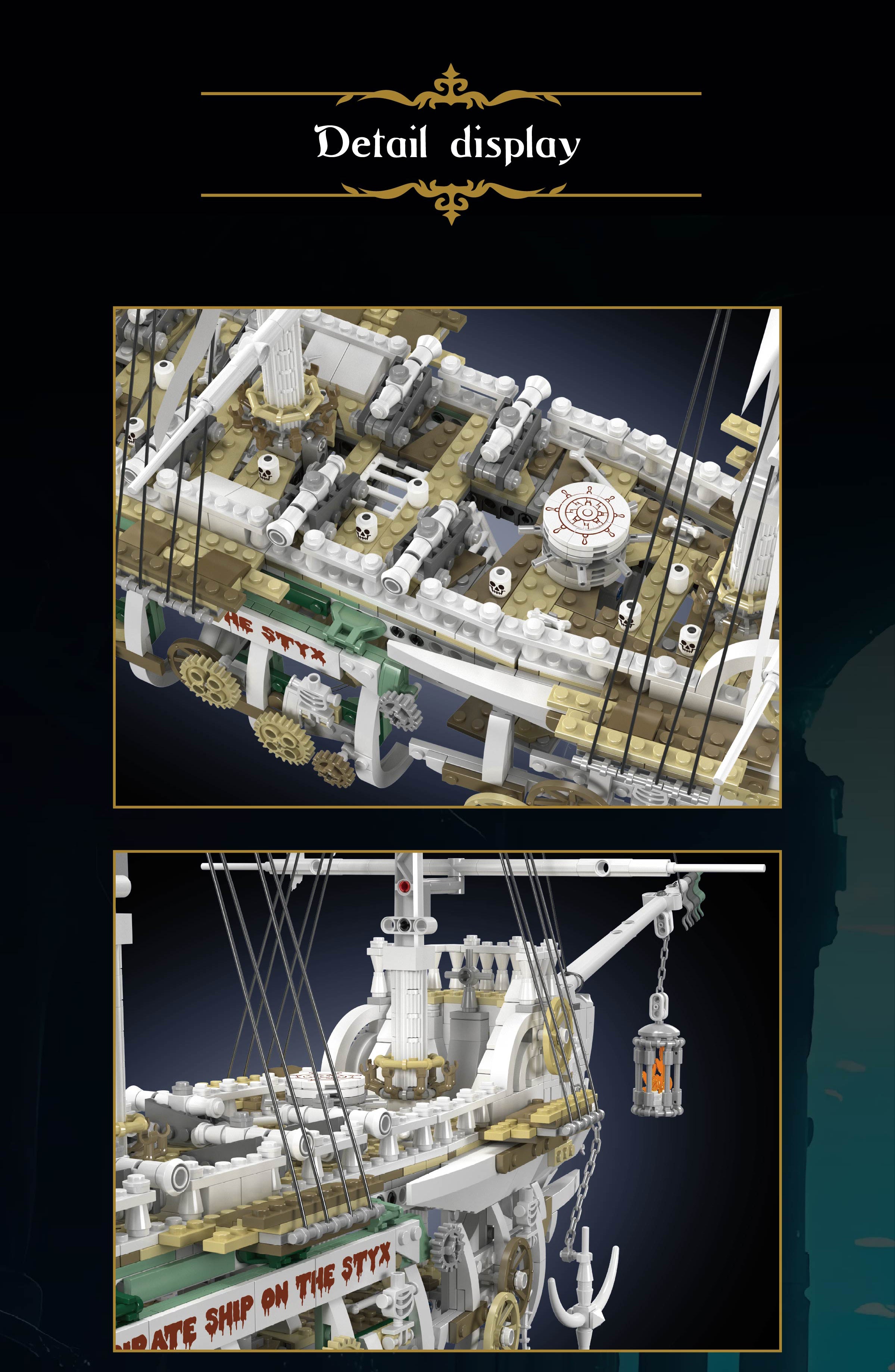 Comprising over 3700 pieces, this spectral vessel offers more than just assembly—it's an entire journey into the pirate domain. Construct the bone anchor, navigate past eight menacing cannons, and climb to the haunted main deck, each component immersing you deeper into this eerie adventure.