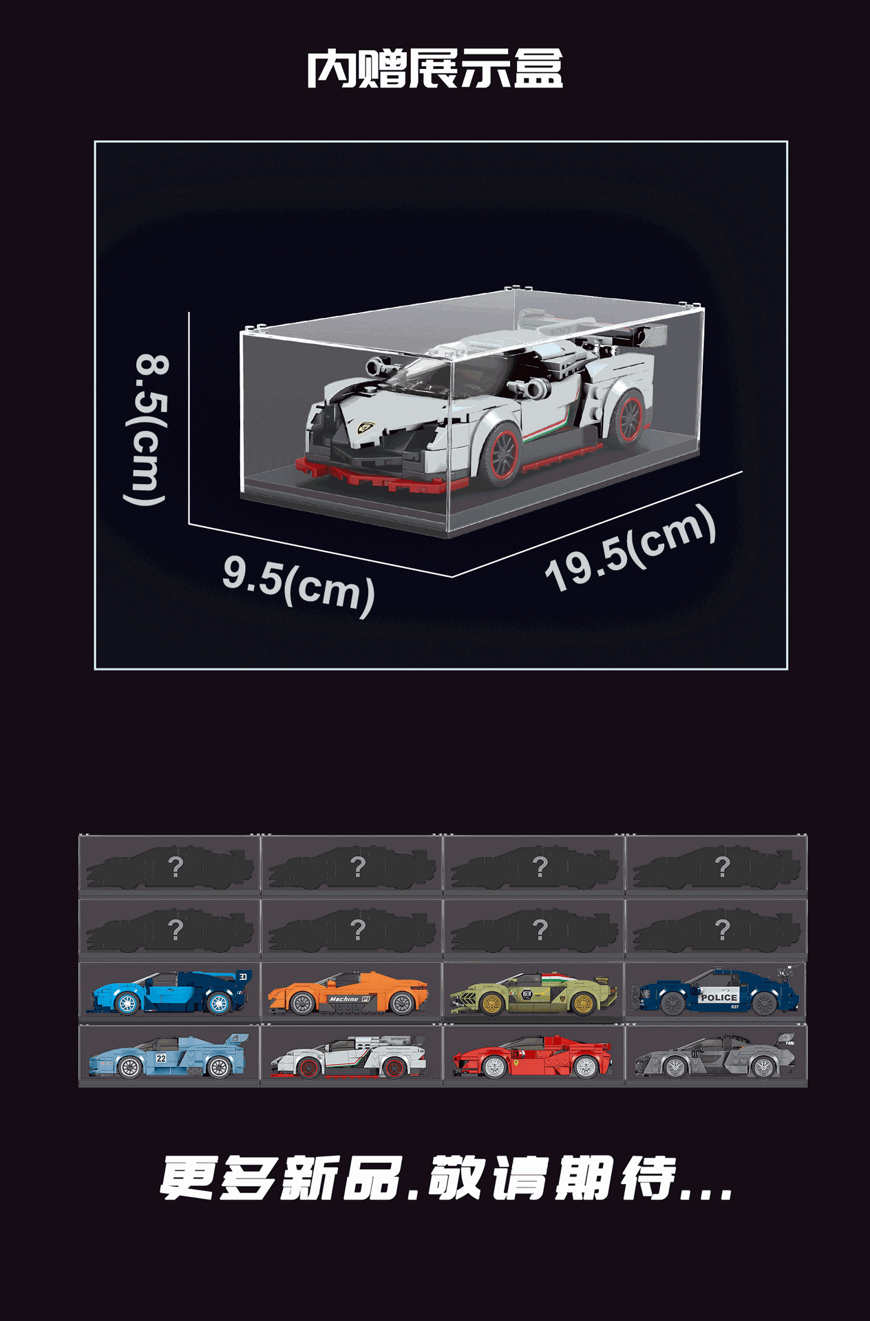 A display case is specially configured, where the spliced building blocks car can be placed inside to keep the car model toy safe and clean, and it can be placed in your favorite place for display and collection.