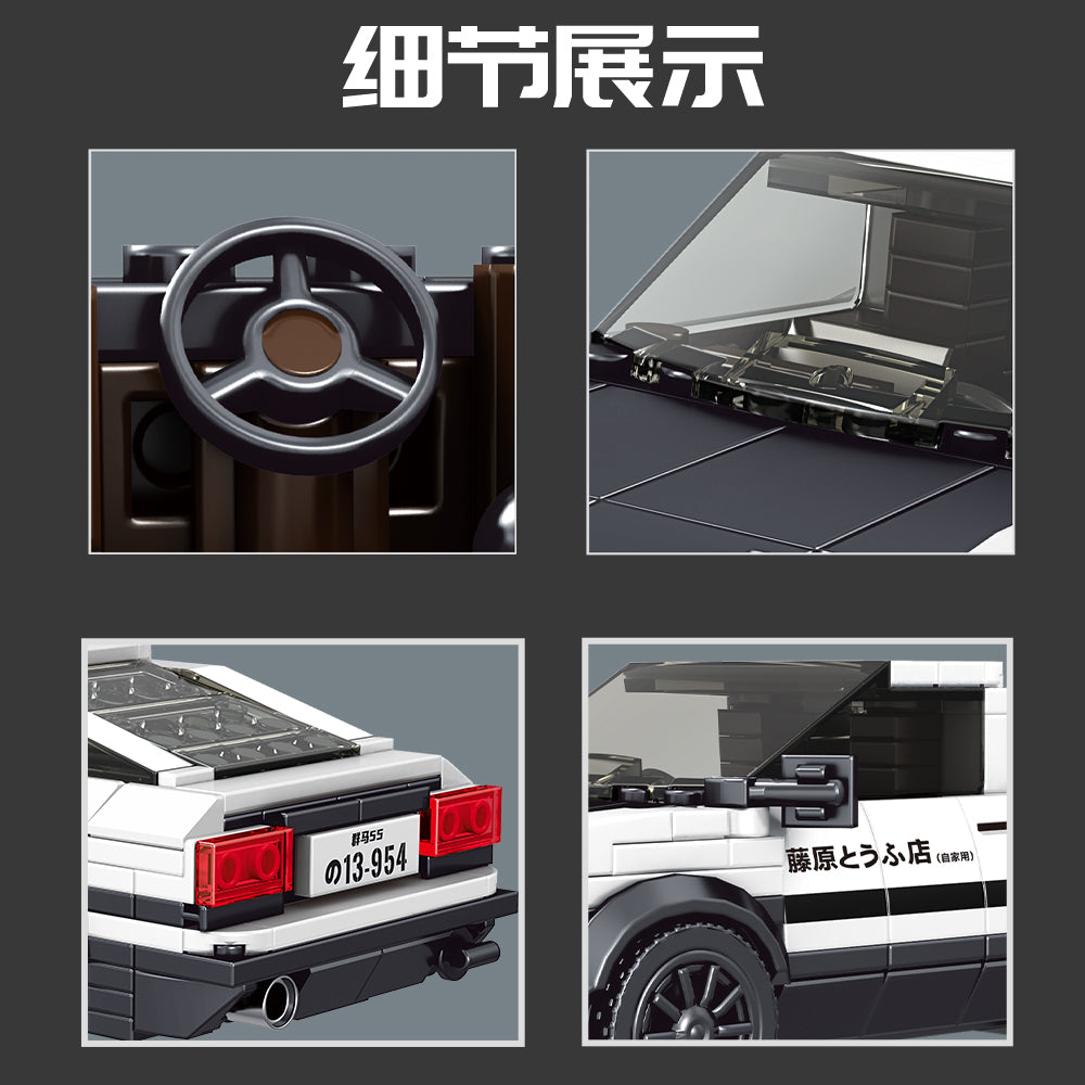 This AE86 model has been replicated with impressive accuracy. The front headlights, fog lights, and taillights have all been faithfully reconstructed using building blocks. The interior of the driver's cabin has also been carefully reproduced, complete with a steering wheel, dashboard, and spacious seats ready to accommodate your single-ponytail mini-figure with ease. The rear trunk opens up, and - you guessed it - there are indeed nine blocks of tofu in the trunk, hitting the very peak of authenticity.
