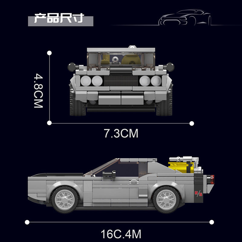 The Mould King® Charger muscle car model is created with 355 pieces and designed for ages 8 and up. The car model has a steering wheel, a streamlined body, a transparent and environmentally friendly windshield, a large rear wing and sliding tires.