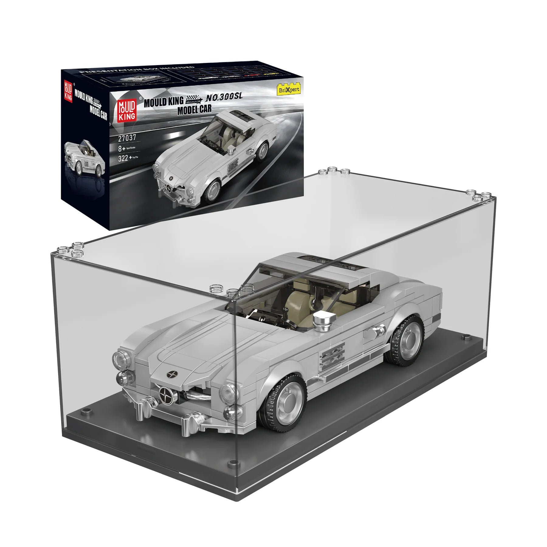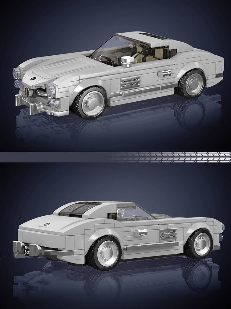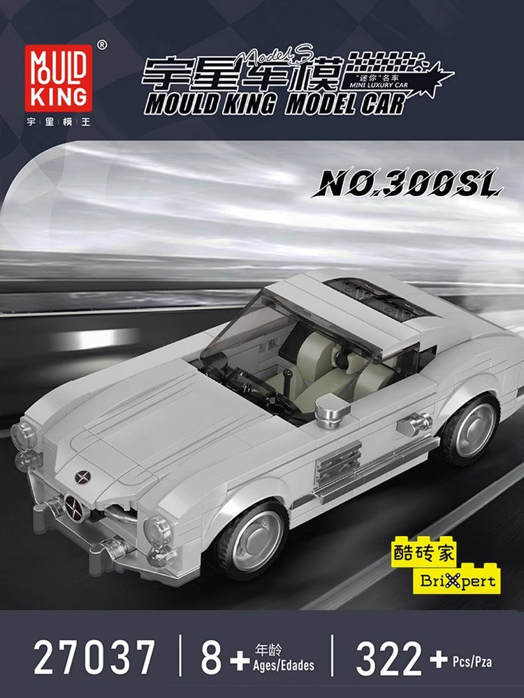 The Mould King® 300SL Sports car model is created with 322 pieces and designed for ages 8 and up. The car model features headlight and taillight, a steering wheel, a streamlined body, a transparent windshield, exhaust-pipe and exquisite sticker.