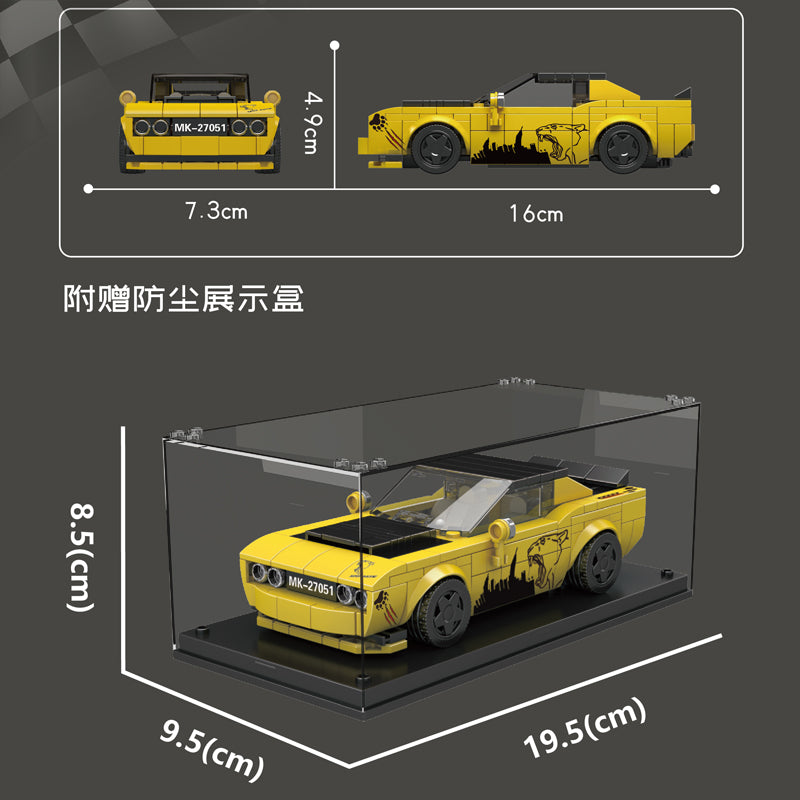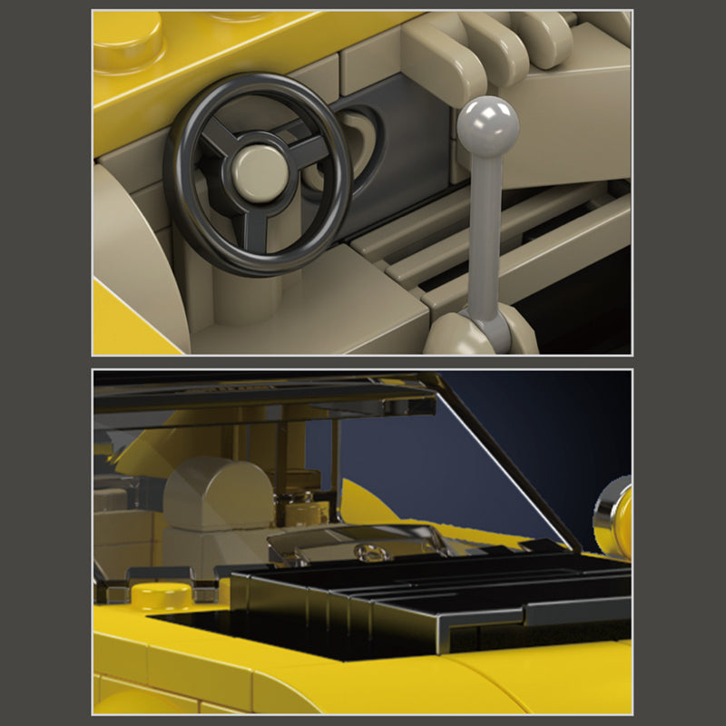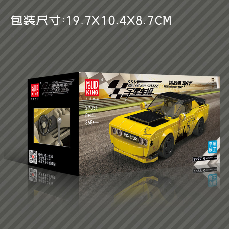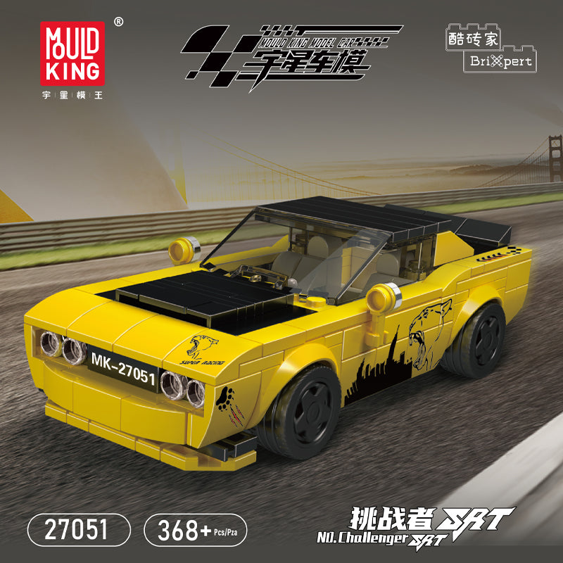 Get ready to roar with the Mould King 27051, an exquisite 8-stud-wide model that channels the spirit of the Challenger SRT. This vibrant yellow build, complete with black racing stripes and the fierce SRT logo, is a bold tribute to the classic American muscle car.
