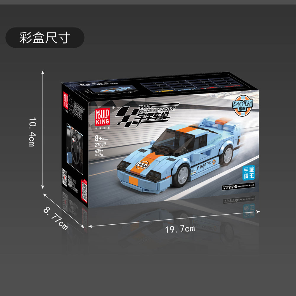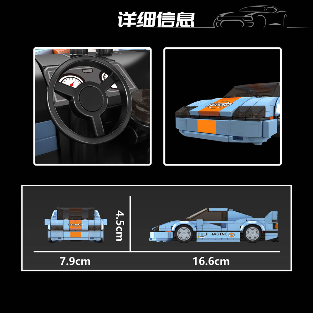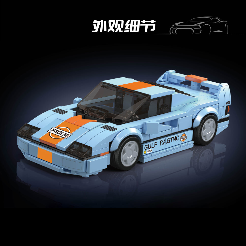 The iconic F40 LM racing style meets precision and color in this 8-wide model. With 435 meticulously designed pieces, this model captures the sleek lines and legendary look of classic sports cars. Built for car enthusiasts and builders alike, it features a vibrant blue-and-orange color scheme that brings energy and character to your collection.